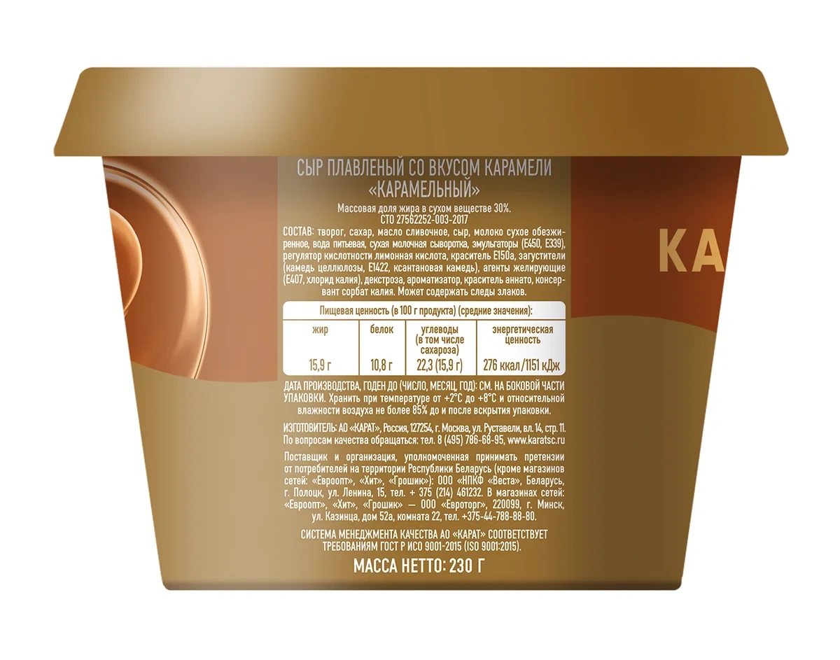 Сыр Карат Карамельный десертный, плавленый, 30%, 230 г отличается неповторимой нежной консистенцией, оригинальным вкусом и характерной для этого сыра текстурой. Производитель использует для его изготовления натуральные ингредиенты, что объясняет его вкусовые качества. Этот сыр полезен: в составе имеется много витаминов, незаменимых аминокислот и микроэлементов. Благотворно влияет на пищеварение, работу организма в целом. Плавленый сыр легко усваивается и обладает приятным вкусом.