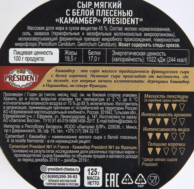 Сыры твердые и полутвердые, в том числе сыр Чеддер, сыр Гауда, сыр Маасдам, сыр Пармезан, содержат ферментный препарат животного происхождения – лизоцим, продукт переработки яиц, вода питьевая, масло сливочное, сухое обезжиренное молоко, молочный белок, комплексные пищевые добавки: эмульгаторы Е331iii, Е452i, Е340ii, Е339iii, сырный порошок, усилители вкуса и аромата Е621, Е627, Е 631, ароматизатор, соль, крахмал кукурузный, загустители: каррагинан, камедь рожкового дерева, Е412, Е466, агент желирующий – хлорид калия, консерванты – сорбиновая кислота, регулятор кислотности – лимонная кислота.