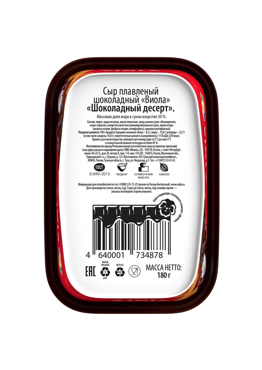 Сыр плавленый Viola Шоколадный десерт ГОСТ 30%, 180г