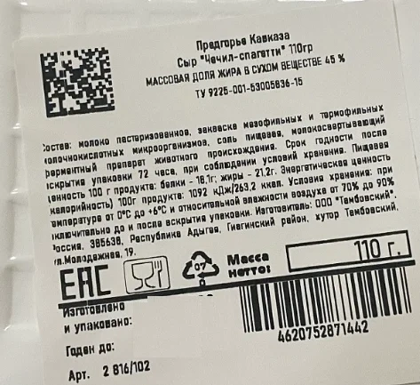 Сыр Предгорье Кавказа Чечил 45%, 110г, спагетти