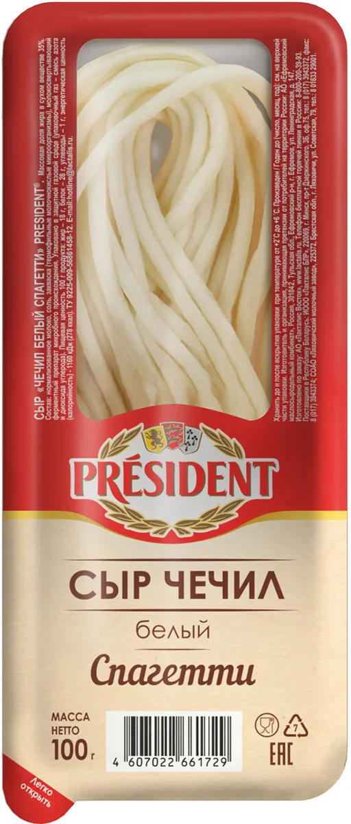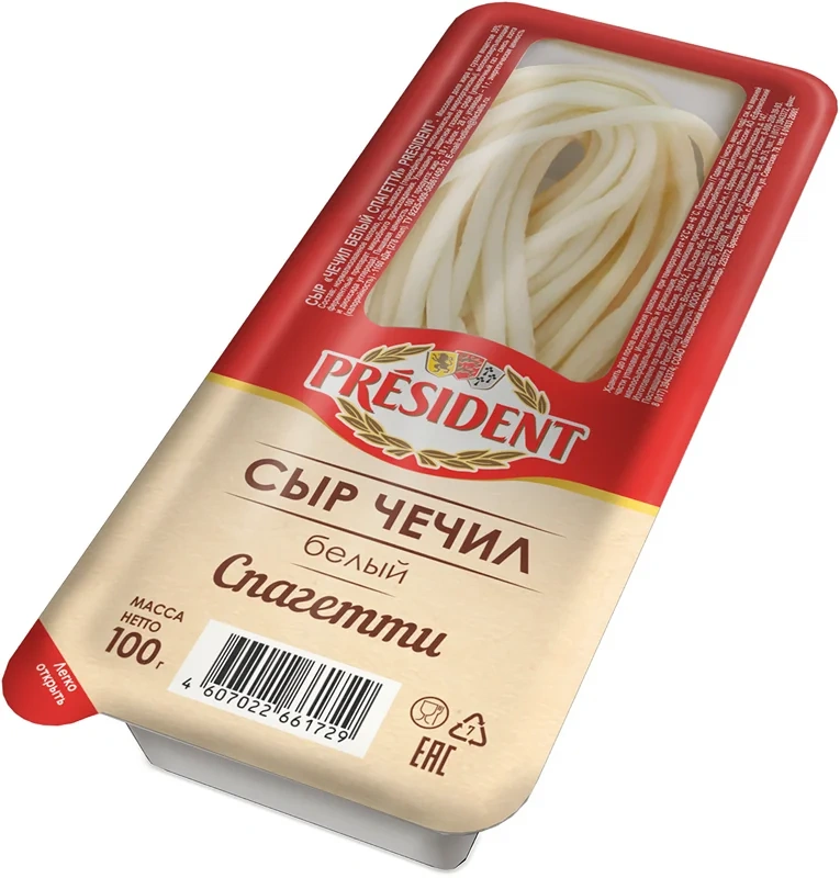 Сыр Чечил President - это натуральный сыр, с эластичной волокнистой текстурой, который обладает неповторимым соленым вкусом и может служить превосходным перекусом. Чечил хорошо подходит в качестве независимой закуски, например, в дороге. Вкус этого сыра самодостаточен, его можно не совмещать с другими продуктами, тем не менее он отлично сочетается со свежими овощами и хлебом. Полутвёрдый сорт, который обладает плотной текстурой с абсолютным отсутствием глазков, а также немного резким и кисловатым ореховым вкусом. У него приятный золотисто-красный оттенок. Нередко Чеддер применяют при приготовлении различных омлетов, салатов, сырных бисквитов, канапе, гамбургеров и других блюд. Из этого сыра получается аппетитный соус, который выступит удачным дополнением к рыбе, мясу, картофелю и тостам.