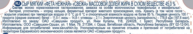 Сыр мягкий Савушкин продукт Sveza Фета Нежная 45%, 250г обладает сбалансированным умеренно соленым вкусом и особенной нежной, мягкой консистенцией. Он отличается нежной текстурой и слегка кисловатым ароматом, характеризующим качественные кисломолочные продукты. С брынзой можно готовить огромное количество блюд, в том числе первые и вторые, использовать в качестве начинки для выпечки, добавляя в него пряности и ароматные травы. Сыр идеально подходит для салата. Его удобно нарезать и хранить в контейнере. Продукт поставляется в удобной для транспортировки и хранения упаковке.