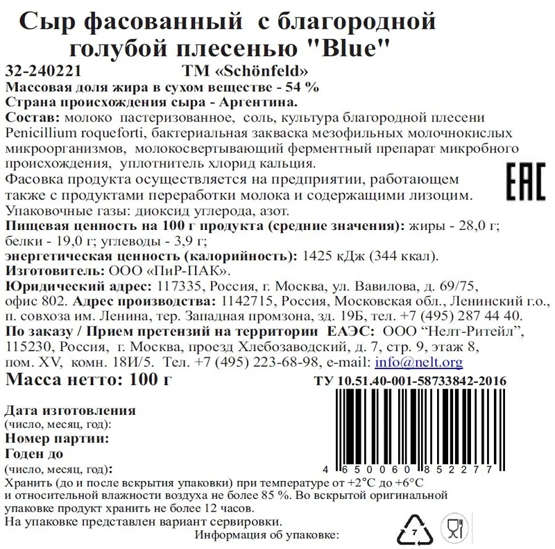 Сыр Schonfeld Блю с голубой плесенью 54%, 100г