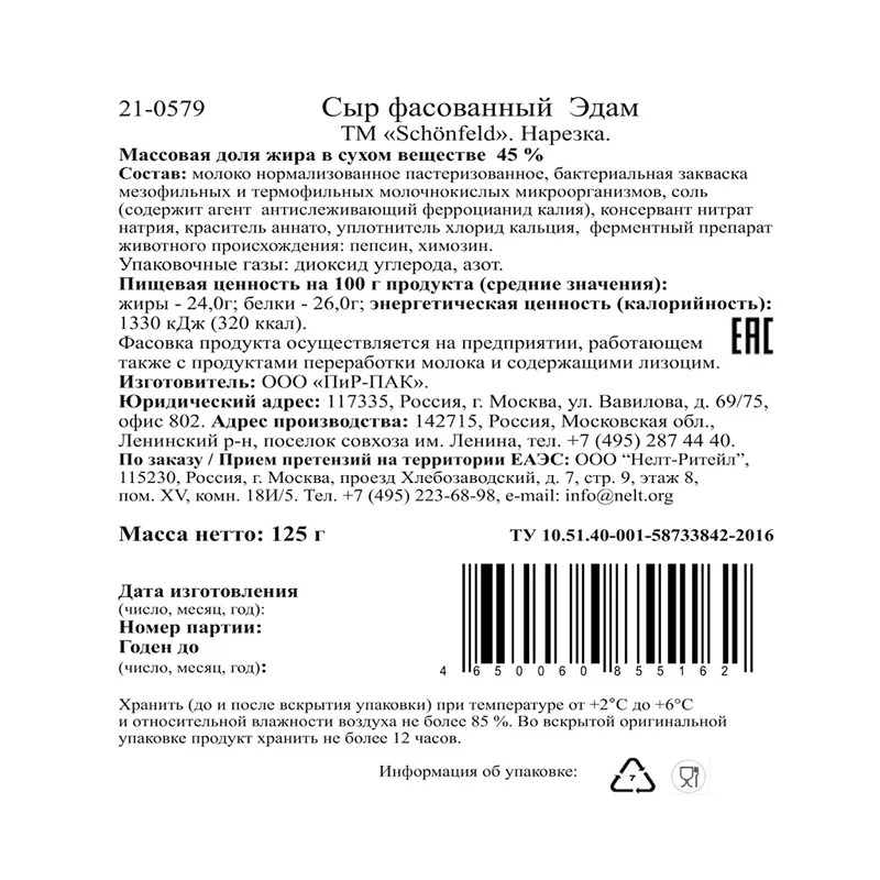 Сыр Schonfeld Эдам полутвердый нарезка 45%, 125г