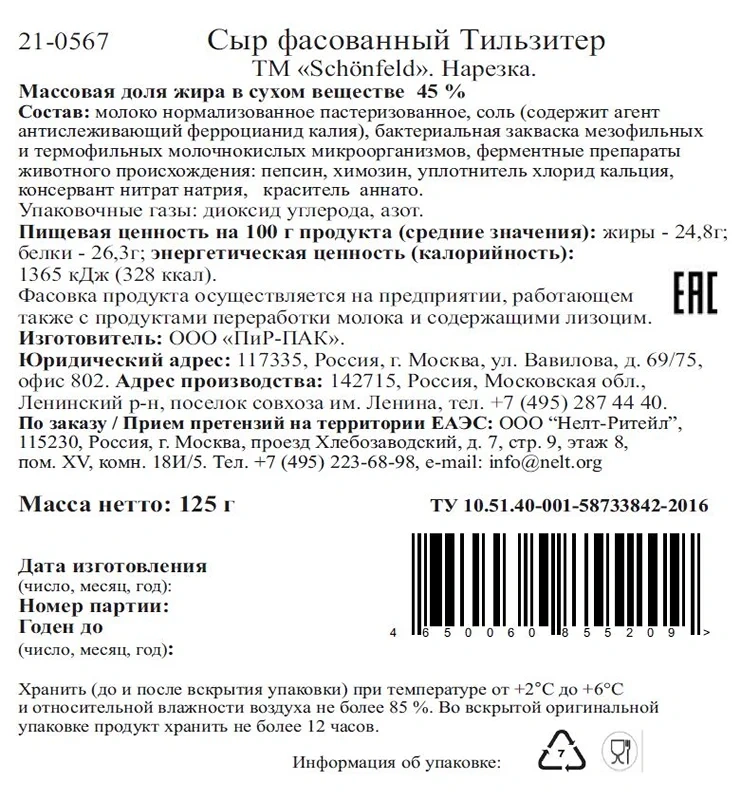 Сыр Schonfeld Тильзитер полутвердый нарезка 45%, 125г