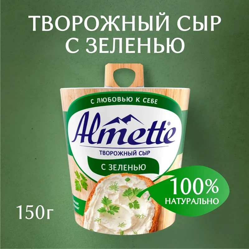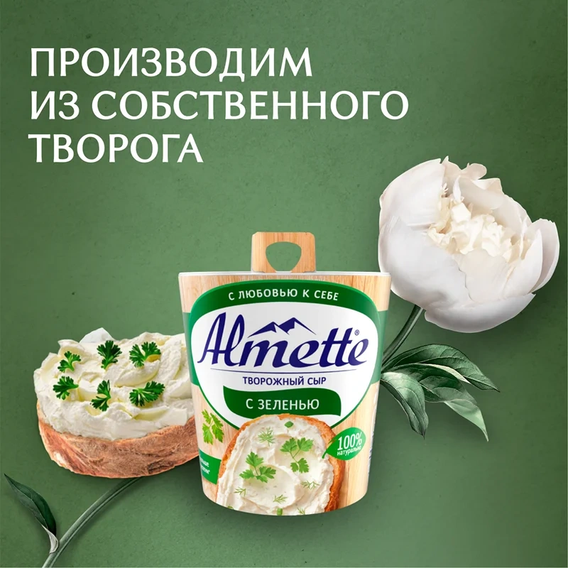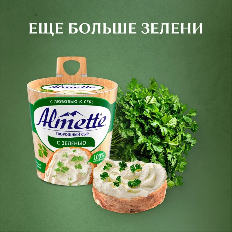 Насладитесь нежным вкусом творожного сыра Almette с зеленью. Сыр творожный подарит вам настоящее удовольствие благодаря свежему вкусу и аромату зелени и 100% натуральным ингредиентам. Almette на брускетте, круассане или багете–прекрасный вариант для завтрака. Сыр Almette так же станет нежным перекусом с любовью к себе, ведь его можно есть даже ложкой. А еще больше зелени* в составе добавит насыщенности вашим закускам.*По сравнению с предыдущим рецептом продукта