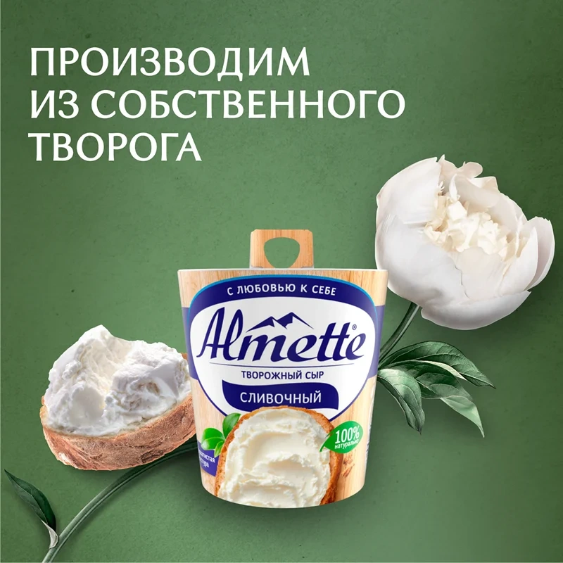 Творожный сыр Almette сливочный – это творожный сыр с нежной бархатистой текстурой и натуральным сливочным вкусом, который идеален как на хрустящем багете, ароматном круассане, так и в качестве легкой закуски. Например, с ломтиком ветчины или кусочком красной рыбы слабого посола. Сыр творожный сливочный Almette приготовлен из 100% натуральных ингредиентов, чтобы вы наслаждались вкусом и качеством с любовью к себе.Творожный сыр дополнит ваши любимые брускетты, а значит, идеально подойдет для завтрака, и, кроме того, станет отличным вариантом легкого перекуса, ведь его можно есть ложкой!