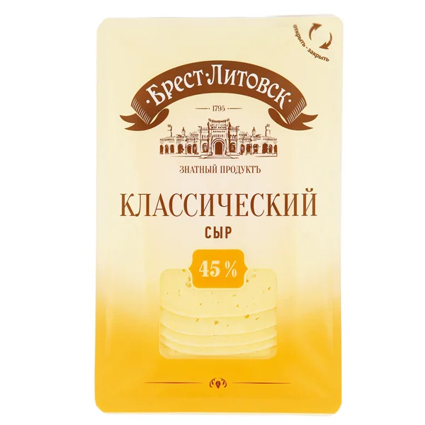 Сыр Брест-Литовск классический 45% нарезка, 150г БЗМЖ представляет собой традиционный полутвердый сыр с нежной консистенцией. Легкий сливочный вкус с кисломолочным послевкусием и частыми дырочками. Продукт изготовлен под строгим контролем качества и с соблюдением всех норм безопасности на производстве. В составе натуральное молоко, без заменителей молочных жиров. Сыр – незаменимое дополнение чаепития или приготовления некоторых горячих блюд. Он содержит в себе кальций, белок, полезные жиры и фосфор. Все эти элементы необходимы нашему организму каждый день. Сыр уже порезан и помещен в удобную упаковку.
