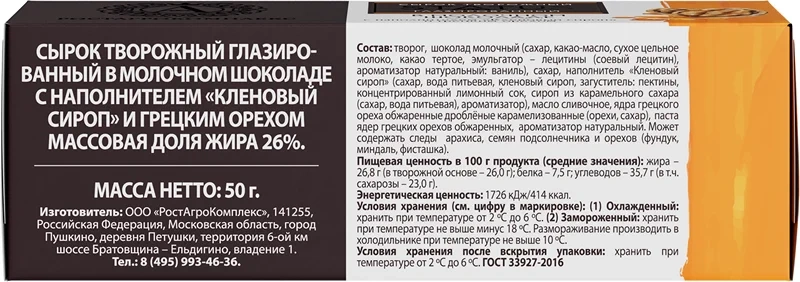 Сырок глазированный А.Ростагрокомплекс кленовый сироп и грецкий орех 26%, 50г
