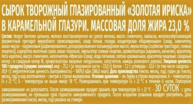 Сырок творожный глазированный Золотая ириска в карамельной глазури. Нежный молочный десерт из натурального творога с добавлением сливочного масла порадует больших и маленьких сладкоежек. У десерта сладкий сливочно-карамельный вкус, напоминающий ирис, а также приятная тающая консистенция. Продукт произведён из отборных ингредиентов, не содержит синтетических красителей и ароматизаторов. Творожный глазированный сырок станет приятным дополнением к завтраку или полднику. Десерт хорошо сочетается с чаем и кофе, поэтому подойдёт в качестве дневного перекуса.
