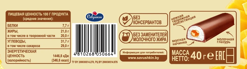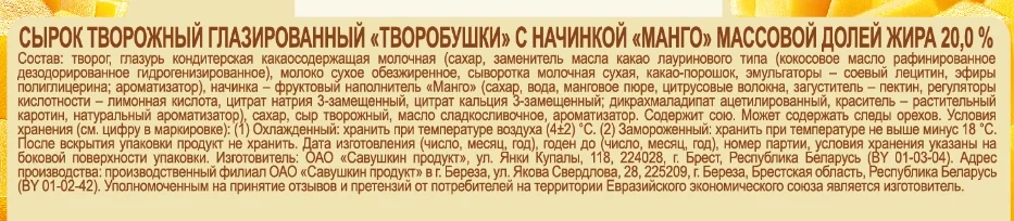 Вкусные белорусские сырки из натурального творога обладают однородной консистенцией и хрустящей шоколадной глазурью. Творожно-фруктовый вкус с экзотическими нотами порадует ценителей необычных творожных десертов. На изготовление сырков идёт отборный творог с добавлением молока, сливочного масла и творожного сыра. Экзотический вкус придаёт манговое пюре с нотами цитруса. Шоколадная глазурь равномерно покрывает мягкую массу. Творожные сырки подойдут на десерт, а также в качестве питательного перекуса.