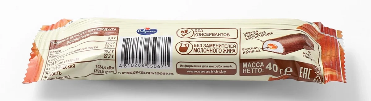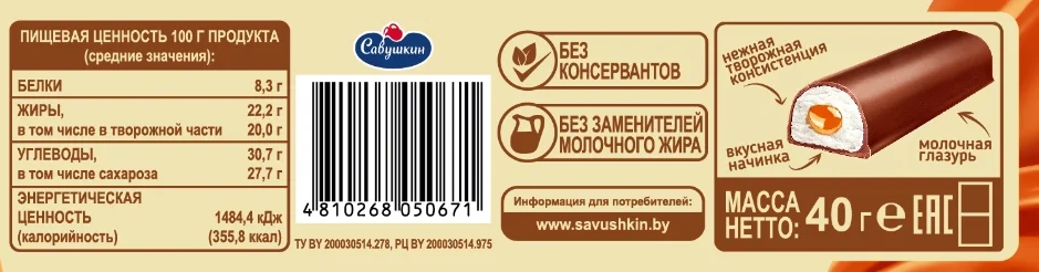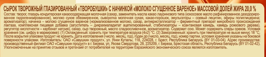 Сырок творожный глазированный Творобушки с начинкой Молоко сгущенное вареное 20%, 40г