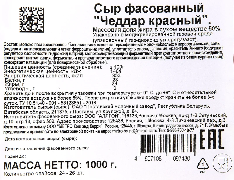 Сыр в нарезке Metro Chef Чеддер красный 50%, 1кг