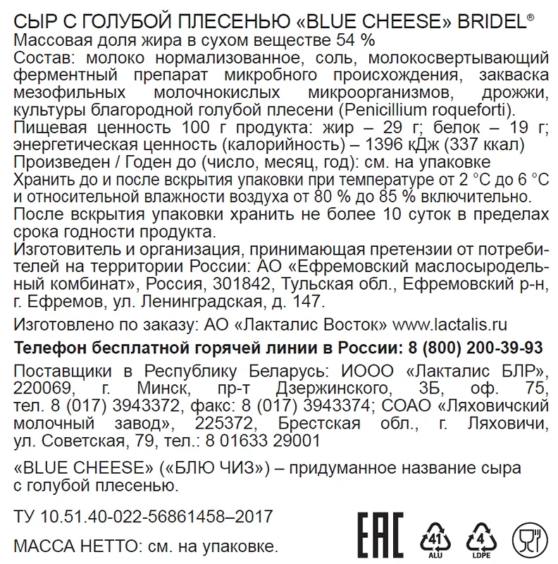 Сыр мягкий Bridel Blue Cheese с голубой плесенью 54%, 100г