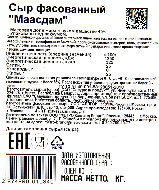 METRO Chef Сыр Маасдам 45%, ~1кг