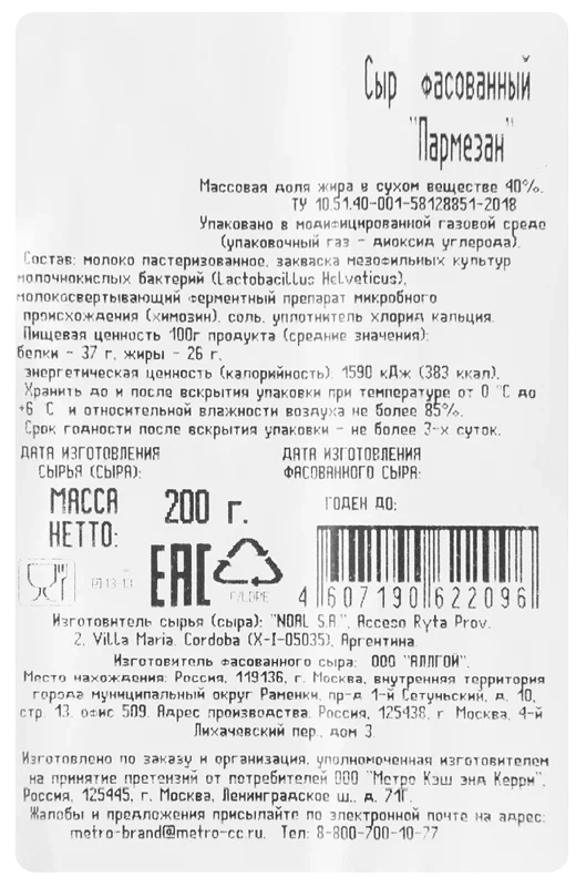 METRO Chef Сыр пармезан выдержка 6 месяцев 40%, 200г