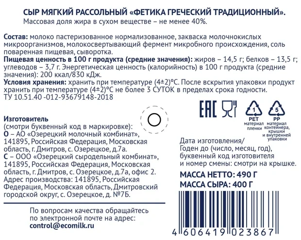 Сыр Экомилк Fetica Греческий рассольный 40%, 490г