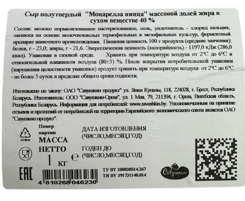 Сыр Савушкин продукт Моцарелла для пиццы полутвердый 40%, ~2.5кг