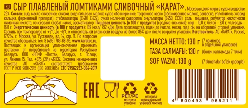 Сыр плавленый Карат сливочный треугольники 25%, 130г