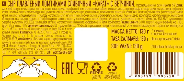 Сыр плавленый Карат с ветчиной в ломтиках 25%, 130г