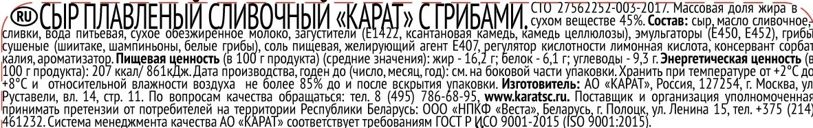 Сыр плавленый Карат сливочный с грибами 45%, 200г