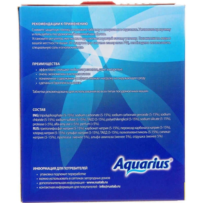 Назначение: таблетки Aquarius эффективно очищают любые загрязнения, даже застарелые. Очень экономичны в использовании, оптимальная формула состава обеспечивает прекрасный результат. Таблетки для посудомоечных машин Все в 1 Aquarius изготовлены по новым технологиям и рекомендуются для использования в посудомоечных машинах ведущих производителей. Специальные компоненты, входящие в состав таблеток, не только эффективно удаляют даже стойкие загрязнения, но и защищают посудомоечную машину от повреждения и коррозии, поддерживают ее чистоту. Таблетки для мытья посуды Aquarius защищают посуду от помутнения, эффективно удаляют чайный налет и легко растворяются сами. При использовании предупреждают появление водных пятен, удаляют загрязнения и засохший жир. Очень экономичны в использовании, оптимальная формула состава обеспечивает прекрасный результат, практичность и экологичность применения.