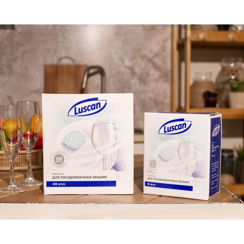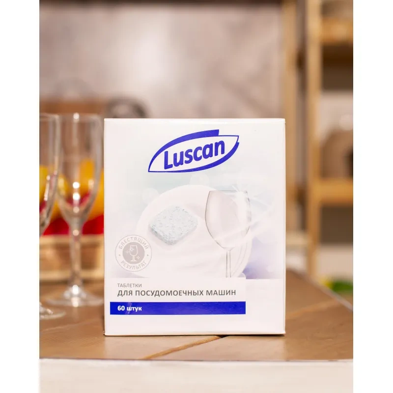 Таблетки для посудомоечных машин Luscan Optima (60 штук в упаковке). Назначение: таблетки нового поколения Luscan разработаны специально для использования в бытовых посудомоечных машинах всех типов. Формула таблеток с натуральными компонентами идеально удаляет сложные загрязнения, растворяет жиры, отмывает белковые загрязнения как при коротких циклах мойки, так и при длинных. Активный кислород в составе таблетки обладает антибактериальными свойствами, способствует удалению пигментов от кофе и чая. Таблетки полностью смываются водой, не оставляя разводов на посуде. Таблетки способствуют смягчению воды и препятствуют образованию накипи. Способ применения: удалите с посуды остатки пищи. Загрузите посуду в ПММ в соответствии с инструкцией. Снимите защитную пленку и положите таблетку в дозировочный отсек для моющих средств. Выберите программу мойки в соответствии со степенью загрязнения посуды и включите ПММ. Не кладите таблетку в корзину для столовых приборов. Для достижения наилучших результатов мытья посуды используйте специальную соль для ПММ, руководствуясь инструкцией к вашей ПММ, и следите, чтобы отсек для соли всегда был заполнен. Если на панели управления ПММ загорелся индикатор «СОЛЬ», добавьте соль в контейнер. Не рекомендуется мыть в ПММ изделия из дерева, кости, алюминия, мельхиора, хрусталя, серебра и драгоценных металлов, антикварную посуду и посуду с ручной росписью.Меры предосторожности: использовать строго по назначению. Избегать попадания в глаза. В случае попадания в глаза промыть большим количеством воды и обратиться к врачу. Не употреблять внутрь. В случае попадания внутрь прополоскать рот, выпить большое количество воды, немедленно обратиться к врачу и показать эту упаковку.Состав: карбонат натрия более 30%, триполифосфат натрия 15–30%, перкарбонат натрия 5–15%, сульфат натрия 5–15%, хлорид натрия 5–15%, НПАВ менее 5%, знзимы менее 5%, поликарбоксилаты менее 5%, ацетат цинка. Условия хранения: Хранить в недоступном для детей и домашних животных сухом месте отдельно от пищевых продуктов, избегая попадания прямых сонечных лучей вдали от источников тепла при температуре от 1°C до 35°C, избегать попадания влаги. Срок годности: 4 года с даты производства. По истечении срока годности утилизировать как бытовые отходы. Дата изготовления указана на упаковке.
