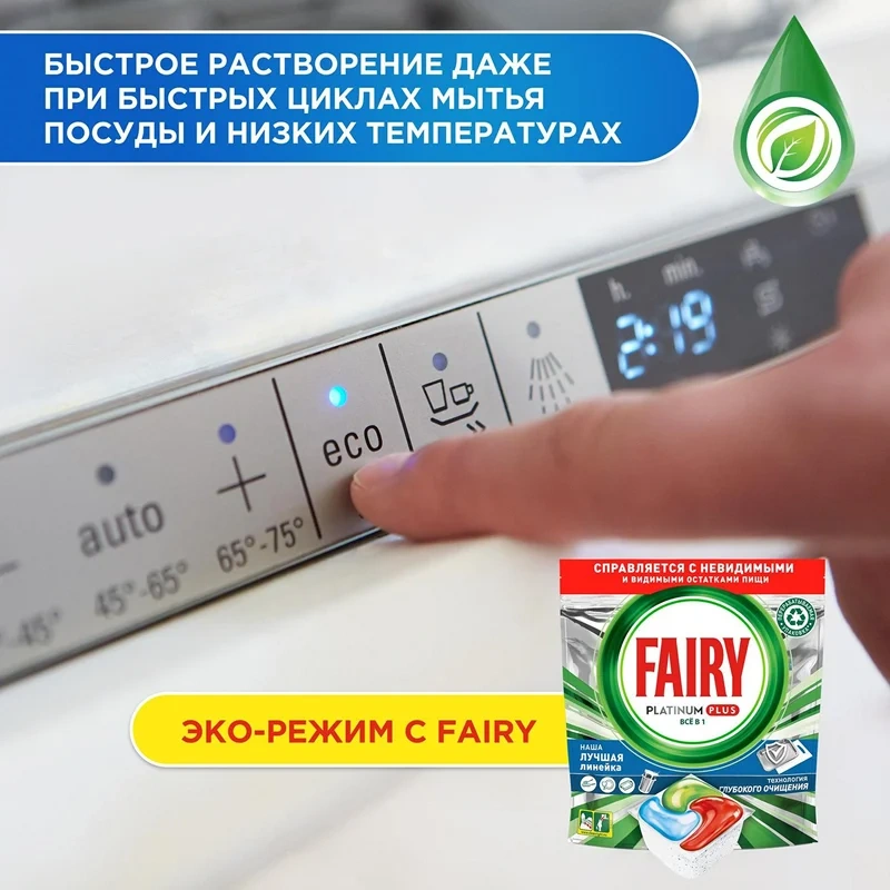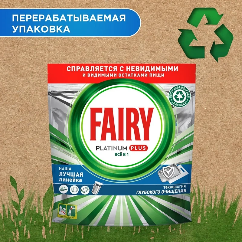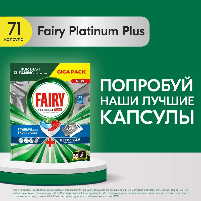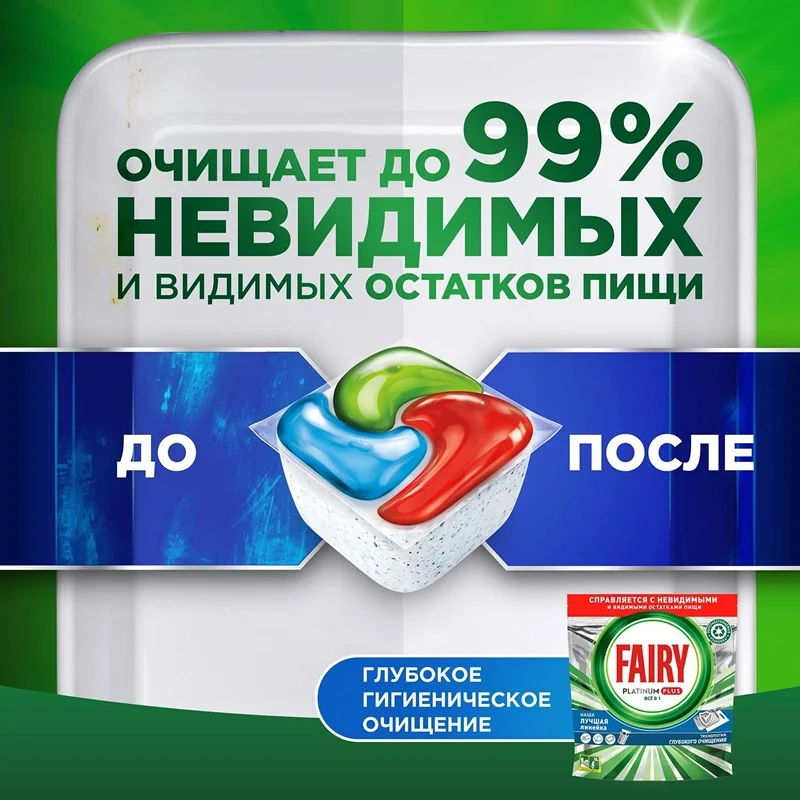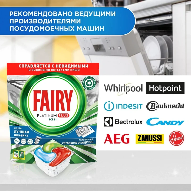Капсулы для посудомоечной машины обеспечивают самое лучшее очищение от Fairy и помогают удалить даже образовавшийся со временем налет, возвращая посуде ее первоначальный блеск. Fairy Platinum Plus оснащены встроенной системой предварительного ополаскивания и выполняют этот шаг за вас. С Fairy Platinum Plus вам не нужно предварительно смывать остатки еды с посуды, что позволяет экономить воду и делает мытье посуды более экологичным. Fairy объединяет гель и порошок в одной мощной капсуле. Оболочка капсулы быстро растворяется в воде и подходит для коротких циклов мытья посуды, ведь средство начинает работать незамедлительно. А еще капсулы очень удобно использовать. Не нужно разворачивать - просто поместите их в отсек посудомоечной машины для моющего средства. Капсулы Fairy рекомендуются лидирующими производителями посудомоечных машин, такими как Whirlpool, Hotpoint, Indesit, Candy, Bauknecht и др. Подходят для всех типов посудомоечной техники. Не содержит хлора и фосфатов. Благодаря функции эффективного ополаскивания вам не придется использовать дополнительные средства для очистки посудомоечной машины.