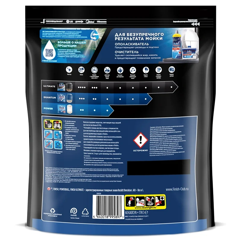 Таблетки для посудомоечных машин Finish Ultimate (60 штук в упаковке) Назначение: Finish Ultimate All in 1 обеспечивает превосходное очищение и безупречный блеск с первого раза. Технология Activelift эффективно справляется с засохшими загрязнениями даже спустя 24 часа без предварительного замачивания. Каждая капсула состоит из трех частей: порошок — удаляет сложные загрязнения, синий гель — нейтрализует жир, красный гель — придает ослепительный блеск. Более того, капсулы Finish Ultimate All in 1 защищают вашу стеклянную посуду и столовые приборы от помутнения, сохраняя их блеск после мытья. Способ применения: не трогайте капсулу мокрыми руками. Не разламывайте. Не снимайте оболочку с капсулы, она полностью растворяется в процессе мойки. Поместите 1 капсулу в сухой отсек на 1 цикл мойки. Не кладите капсулу в корзину для столовых приборов. Для наилучшего результата используйте режим «эко» или «авто». Меры предосторожности: содержит субтилизин. Может вызывать аллергические реакции. Может причинить вред при проглатывании. При попадании на кожу вызывает раздражение. При попадании в глаза вызывает выраженное раздражение. Вредно для водных организмов. Хранить в недоступном для детей месте. При попадании в глаза: осторожно промыть водой в течение нескольких минут. Снять контактные линзы, если Вы ими пользуетесь и, если это легко сделать. Продолжить промывание глаз. Если раздражение глаз не проходит, обратиться к врачу, взяв с собой упаковку продукта или этикетку. Не глотать. При случайном проглатывании немедленно обратиться к врачу. При попадании на кожу: промыть большим количеством воды. Более полная информация по безопасному обращению химической продукции находится в паспорте безопасности. Состав: 15 % или более, но менее 30%: неионогенные ПАВ; 5 % или более, но менее 15%: отбеливающие вещества на основе кислорода, поликарбоксилаты, фосфонаты; энзимы, цеолиты, ароматизирующие добавки, в т.ч. бензилбензоат, гераниол. Условия хранения: не хранить с несовместимыми материалами, пищевыми продуктами и питьевой водой. Вскрывать непосредственно перед началом использования. Не хранить без оригинальной маркировки. Срок годности: 2 года.
