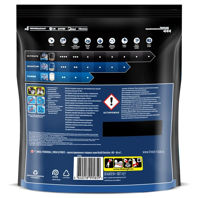 Finish Quantum Ultimate – это трехкамерные капсулы нового поколения с двумя гелевыми компонентами для посудомоечной машины. Каждая капсула состоит из трех частей: белый порошок удаляет сложные загрязнения; синий гель нейтрализует жир; красный гель придает ослепительный блеск. Формула Finish Quantum Ultimate - лучшая формула в линейке Finish, что позволяет каждый раз получать ослепительный результат.