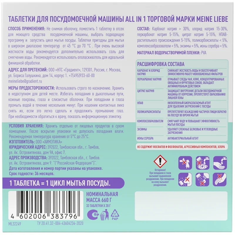 Таблетки для посудомоечных машин All in One от Meine Liebe - это надежный помощник вашей семьи. Благодаря специальной формуле с энзимами, ионами серебра и кислородным агентом, посуда и столовые приборы будут сиять. Активный кислород О2 и Ионы серебра Ag+ обеспечивают антибактериальный эффект и безопасное мытье детской посуды. Энзимы и растительный Поверхностно Активные Вещества безупречно удаляют засохший жир, неприятные запахи даже на коротких циклах и Эко-режиме мытья посуды. Таблетки упакованы в водорастворимую оболочку, которую не нужно снимать, легко смываются водой, не оставляют налет и разводы и не требуют дополнительного добавления соли. Формула таблеток Meine Liebe безопасна для домов с автономными канализациями (септиками). Пробуйте новые кулинарные рецепты, приглашайте гостей и наслаждайтесь временем, проведенным вместе. А мы позаботимся о чистоте в вашем доме, о бытовой технике и о посуде так же, как вы заботитесь о своих близких. Все средства Meine Liebe изготовлены по уникальной формуле под контроль качества компании Grunlab (Германия), что гарантирует их надежность и эффективность.