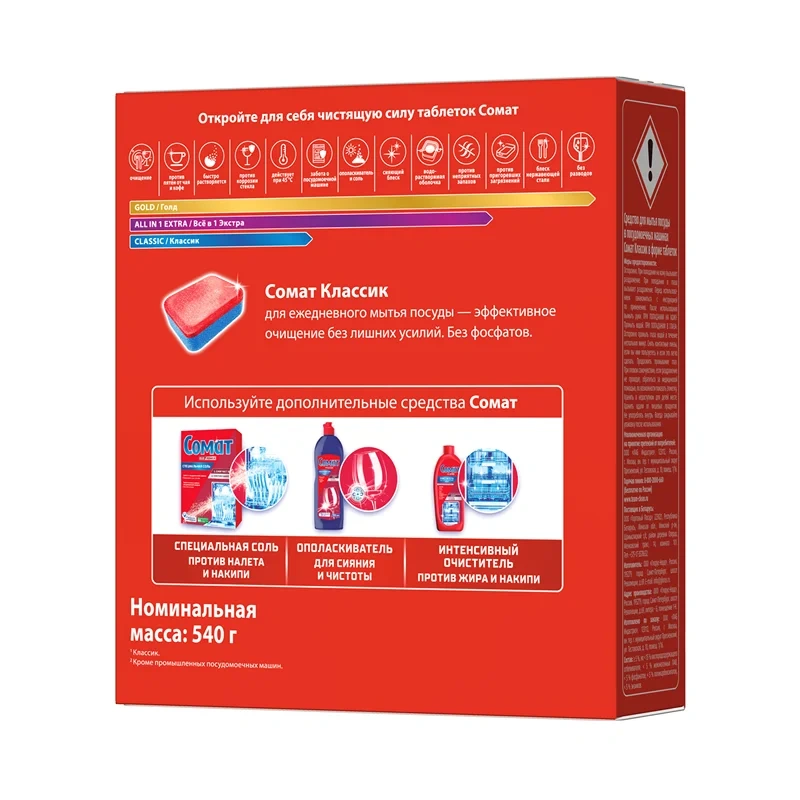 Таблетки для посудомоечной машины Сомат Классик являются базовым моющим средством, которое эффективно удаляет пятна от чая и кофе и обеспечивает защиту стекла от коррозии. Сомат Классик отлично подойдет для ежедневного очищения Вашей посуды. Ослепительная чистота посуды без лишних усилий от Сомат! Откройте для себя чистящую силу таблеток для посудомойки Сомат Классик: ежедневное очищение; против пятен от чая и кофе; быстро растворяется; против коррозии стекла и декора; действует при 45С.