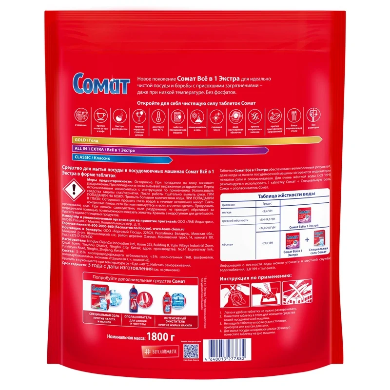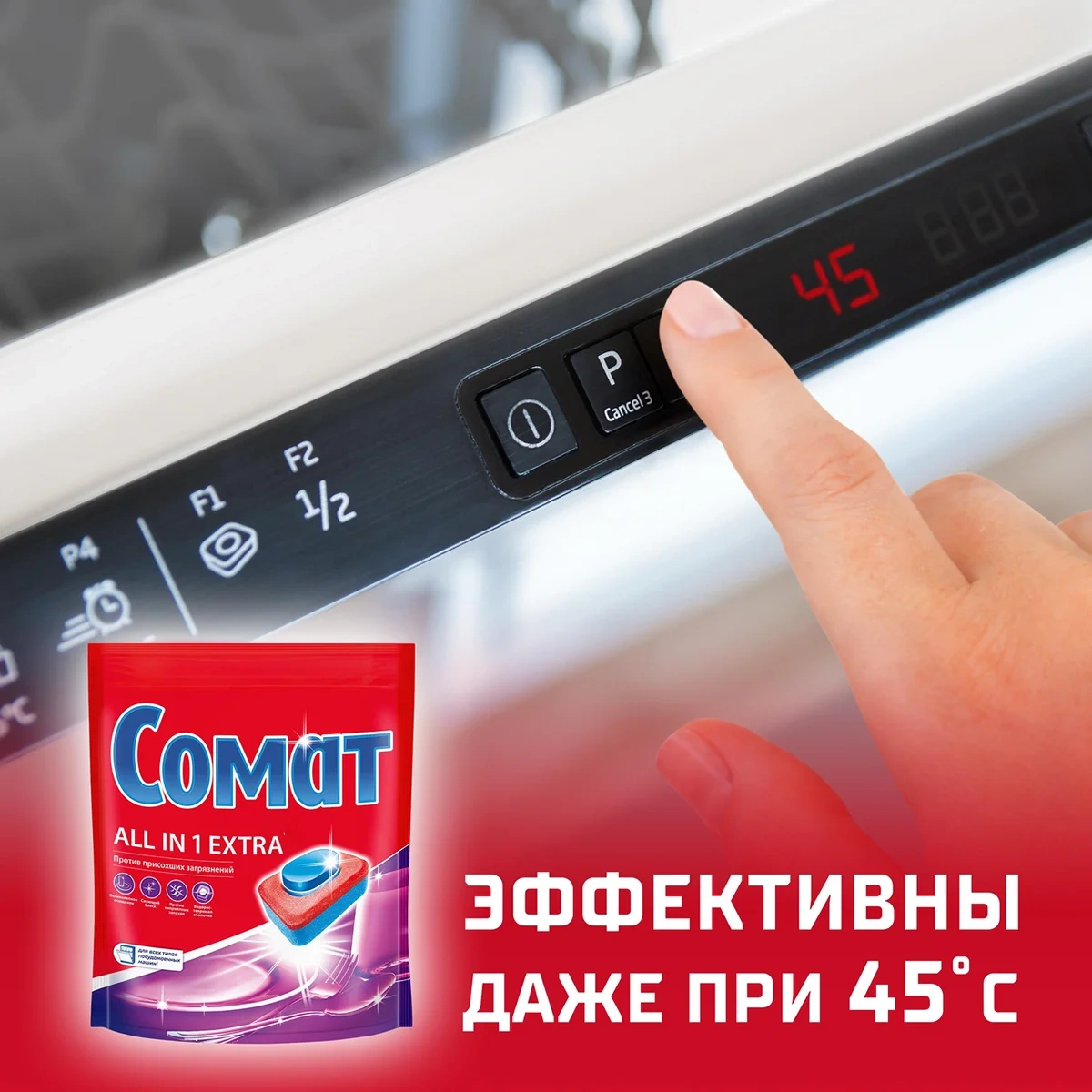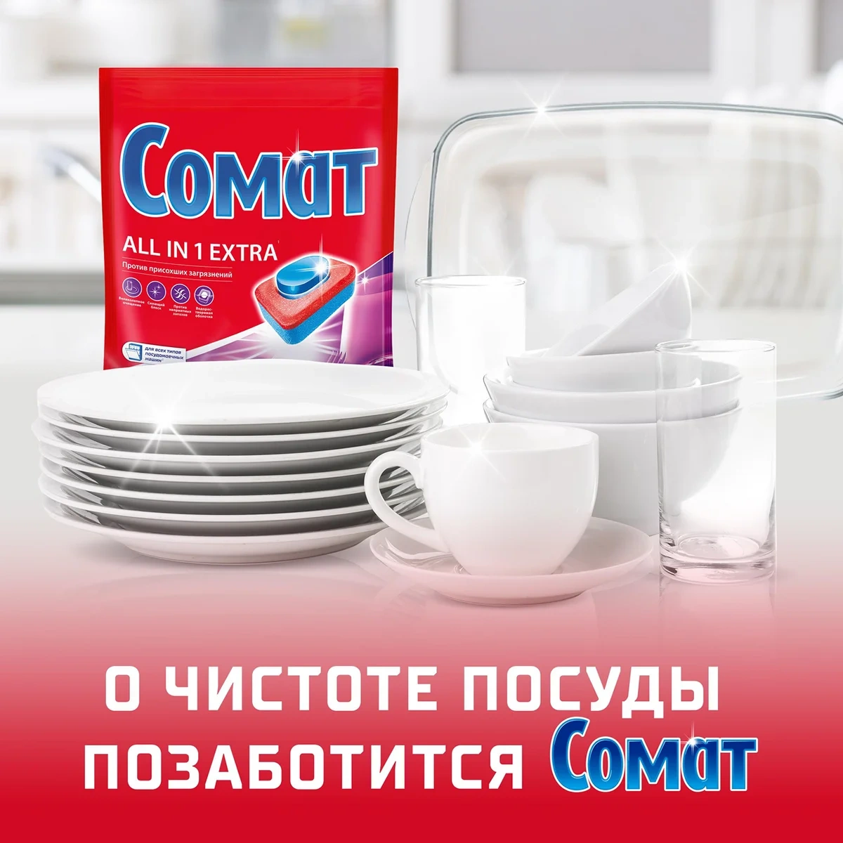 Таблетки для посудомоечной машины Сомат Всё в 1 Экстра содержат 10 активных действий, которые обеспечивают великолепное очищение Вашей посуды даже против таких трудных загрязнений, как присохшая еда, и заботятся о посудомоечной машине. Ослепительная чистота посуды без лишних усилий от Сомат! Откройте для себя чистящую силу таблеток Сомат Всё в 1 Экстра: великолепное очищение; против пятен от чая и кофе; быстро растворяется; против коррозии стекла и декора; действует при 45С; забота о посудомоечной машине; функция ополаскивателя и соли; сияющий блеск; водорастворимая оболочка; против неприятных запахов.