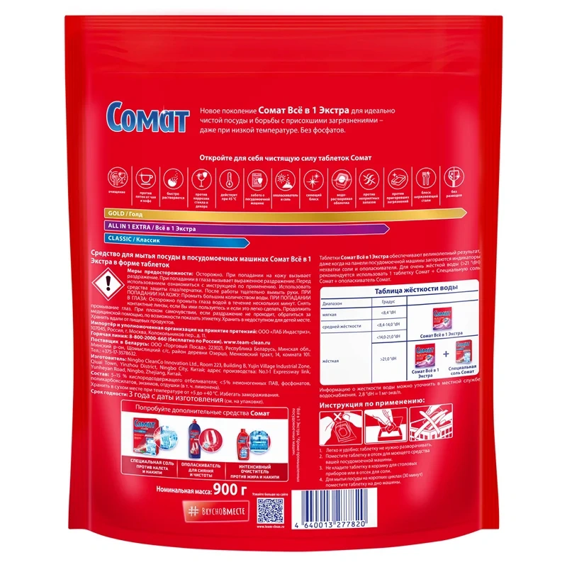 Таблетки для посудомоечной машины Сомат Всё в 1 Экстра содержат 10 активных действий, которые обеспечивают великолепное очищение Вашей посуды даже против таких трудных загрязнений, как присохшая еда, и заботятся о посудомоечной машине. Ослепительная чистота посуды без лишних усилий от Сомат! Откройте для себя чистящую силу таблеток Сомат Всё в 1 Экстра: великолепное очищение; против пятен от чая и кофе; быстро растворяется; против коррозии стекла и декора; действует при 45С; забота о посудомоечной машине; функция ополаскивателя и соли; сияющий блеск; водорастворимая оболочка; против неприятных запахов.