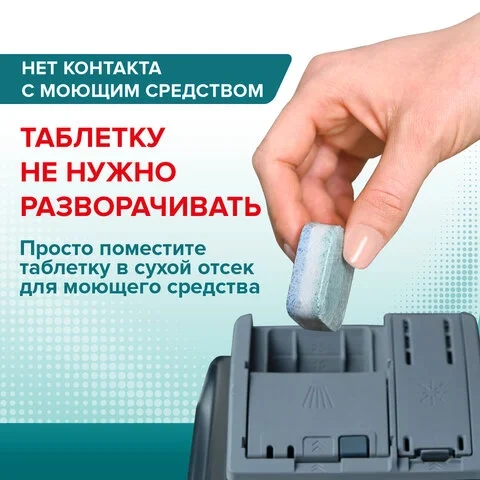 ИНСТРУКЦИЯ ПО ПРИМЕНЕНИЮ: удалите крупные пищевые отходы с посуды и столовых приборов. Загрузите посудомоечную машину в соответствии с инструкциями производителя. Вставьте сухую таблетку в дозатор моющего средства, без её распаковки: таблетки с водорастворимой пленкой растворяются во время мойки. Не кладите таблетку на дно посудомоечной машины или непосредственно в корзину со столовыми приборами. Выберите необходимый цикл мойки и запустите посудомоечную машину. Одной таблетки достаточно независимо от состояния воды.