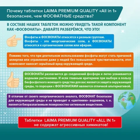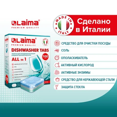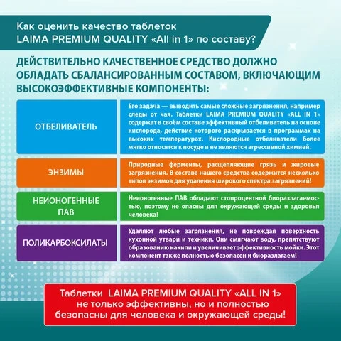 Многофункциональные таблетки для посудомоечных машин LAIMA PREMIUM QUALITY 'All in 1' справляются даже со стойкими загрязнениями благодаря высокоэффективной формуле и действию активного кислорода, расщепляющего жир и остатки пищи. Благодаря сбалансированному, безопасному составу таблетки не вредят посуде и заботятся о посудомоечной машине, а водорастворимая оболочка не только упрощает использование, но и снижает до нуля риск возникновения аллергических реакций за счет полного исключения контакта кожи с моющим средством.