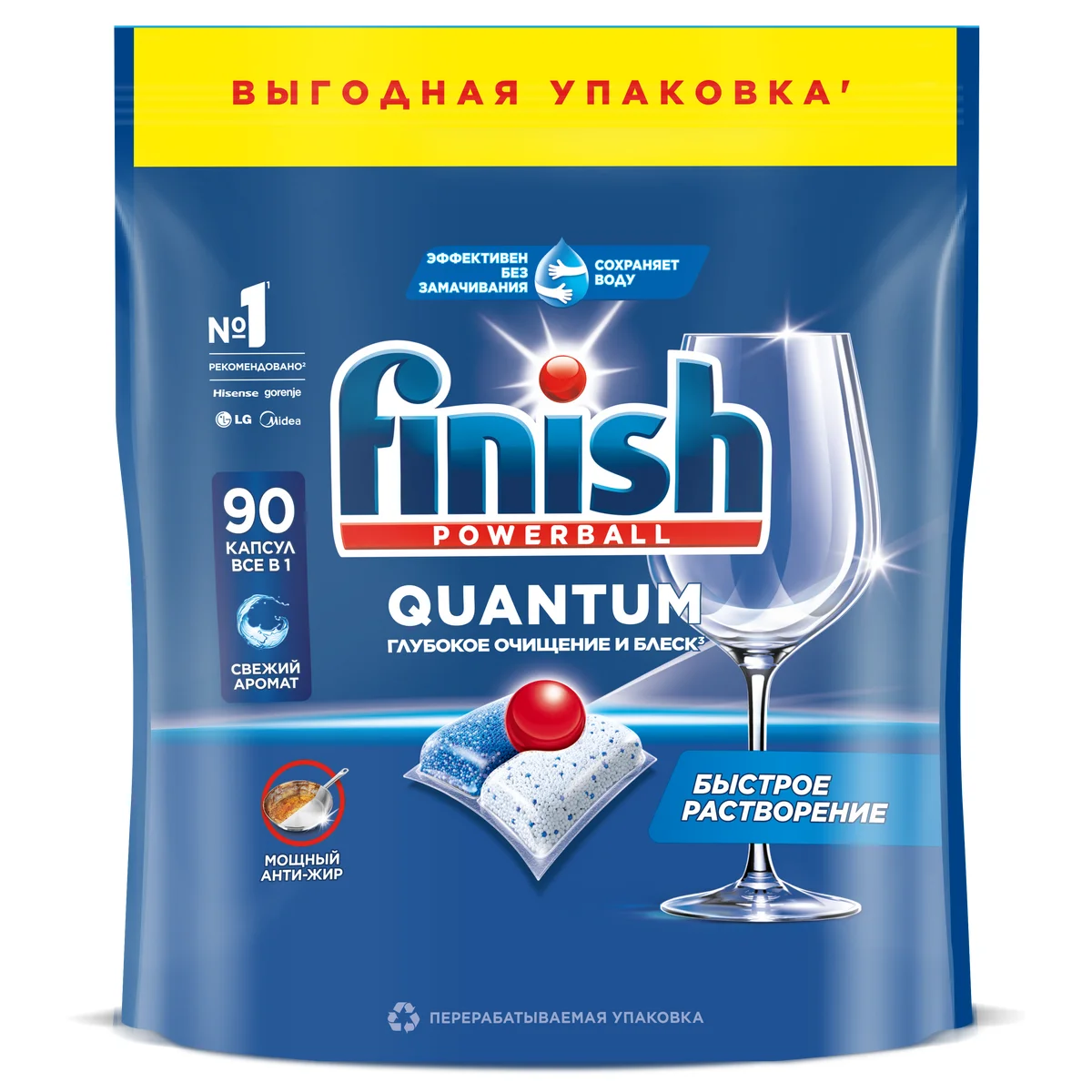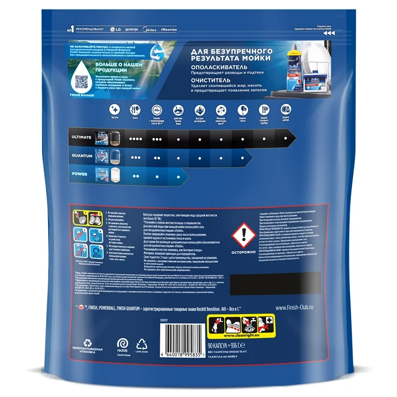 Таблетки для посудомоечной машины Finish Quantum обеспечивают глубокое очищение и ослепительный блеск при каждой мойке. Компактная капсула состоит из трех частей: красный гель нейтрализует жир и придает ослепительный блеск; два компонента порошка удаляют сложные белковые и крахмальные загрязнения, а также содержат отбеливающие компоненты на основе кислорода для удаления налета от чая. Эффективно справляется с различными видами сложных загрязнений даже без предварительного замачивания. Для достижения максимального результата и при очень жесткой воде рекомендуем попробовать специальную соль и ополаскиватель Finish.