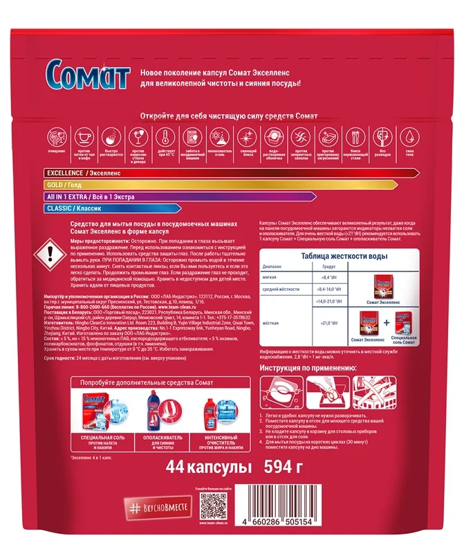 Капсулы для посудомоечной машины Сомат Excellence 4in1, 44шт