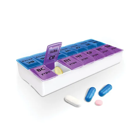 Таблетница представляет собой контейнер с 14 вместительными отделениями, промаркированными по дням недели и суточному режиму приема: утро, вечер. Для удобства крышки утренних и вечерних отсеков отличаются цветом.
