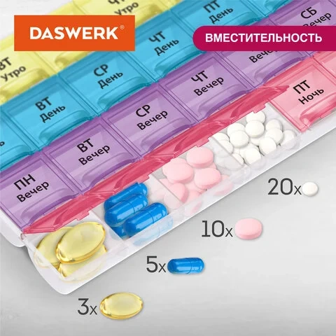 Отделения промаркированы крупным шрифтом по дням недели и суточному режиму приема: утро, день, вечер, ночь. Маркировка выполнена на русском языке при помощи специальной УФ-печати. Надписи не сотрутся от длительного и частого использования.