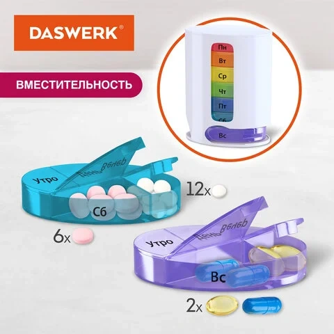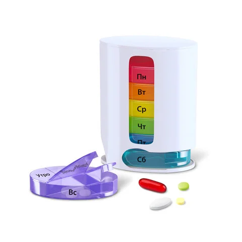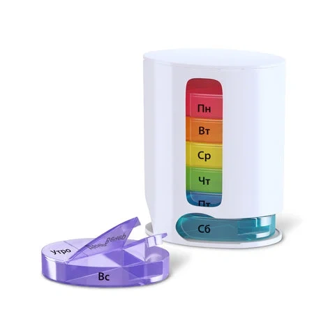 Таблетница представляет собой 7 ежедневных контейнеров с 4 отделениями каждый, расположенных в удобном стильном органайзере, оснащенном крышкой сверху. Органайзер позволяет удобно упорядочить прием лекарств по дням, переставляя контейнер с нужным днём наверх.