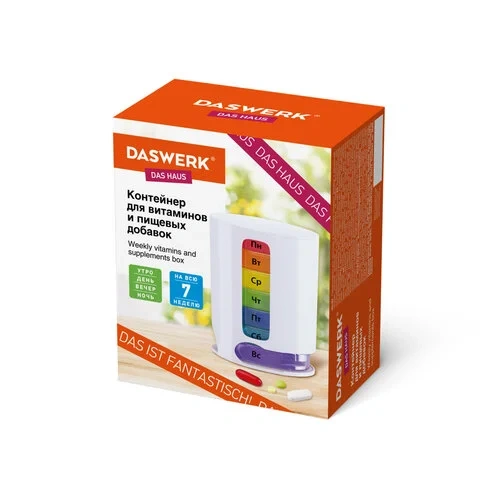 Ежедневные контейнеры надежно закреплены внутри органайзера, благодаря чему можно взять с собой как всю таблетницу, так и отдельные, более компактные, контейнеры на один день. Дома, на работе, в путешествии - упорядоченный прием лекарств и витаминов станет проще с таблетницей-органайзером.