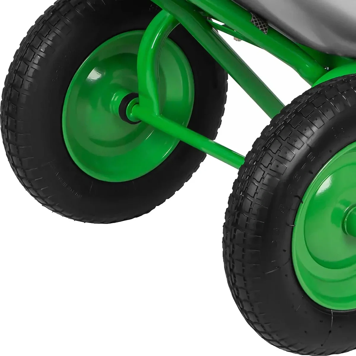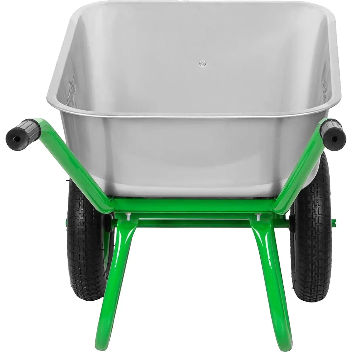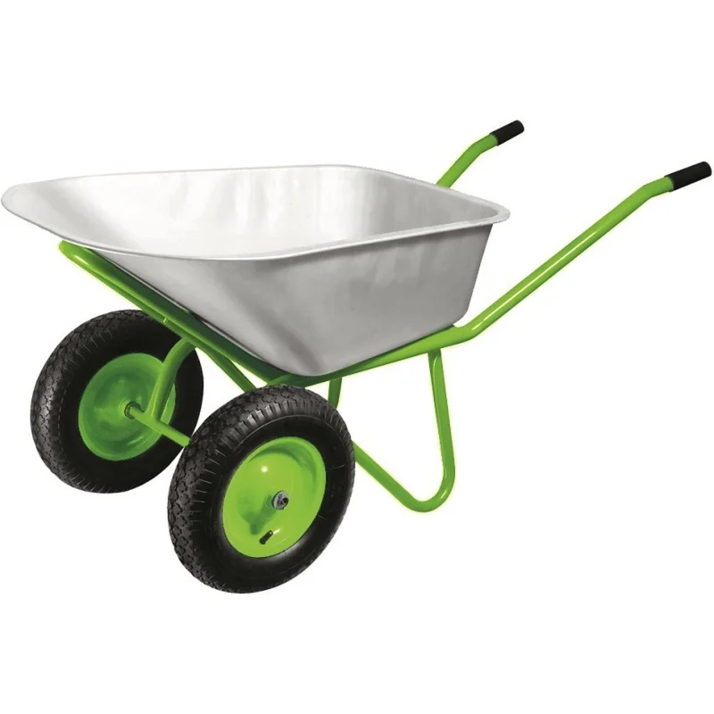 Тачка оснащена двумя пневматическими колесами диаметром 380 мм и шириной 90 мм. Колеса установлены на подшипниках, что облегчает перемещение с грузом и снижает усилие при транспортировке. Двухколесная конструкция повышает устойчивость при перевозке тяжелых грузов. Габаритный размер составляет 1290x620x660 мм, вес - 11.5 кг.