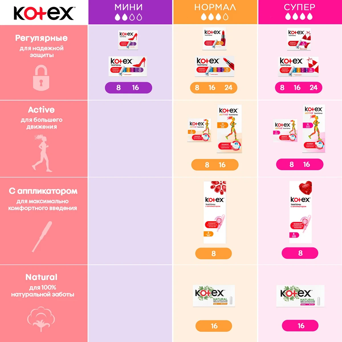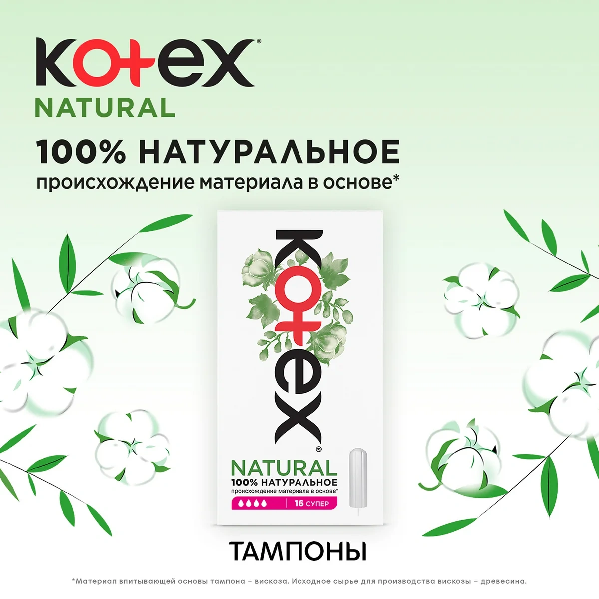 Женские гигиенические тампоны Kotex Natural Супер. Тампон - одно из самых удобных, практичных и гигиеничных средств защиты во время критических дней. Новые тампоны Kotex Natural Супер созданы специально для потребностей современных девушек, которые не только хотят быть уверены в своей защите, но и во всём стремятся к натуральности: благодаря 100% натуральному происхождению материала в основе тампона* новые тампоны Kotex Natural помогут тебе заботиться о своём здоровье и сохранять ощущение уверенности и комфорта в течение всего дня. Тампоны Котекс Natural Супер созданы для использования в те дни, когда нужна особая защита – во время обильных выделений. Каждый тампон упакован в индивидуальный пауч, который удобно брать с собой – поместится даже в самой маленькой сумочке, а нежный женственный дизайн с изображением хлопка добавит удовольствия при использовании. Кроме того, благодаря уникальному механизму 'поверни и открой' тампоны максимально просты, гигиеничны и удобны в использовании. *Материал впитывающей основы тампона – вискоза. Исходное сырье для производства вискозы – древесина.