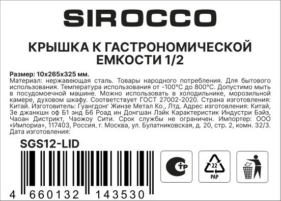 Крышка для гастроемкости нержавеющая сталь 1/2