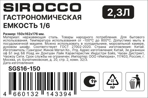 Гастроемкость нержавеющая сталь 1/6 150мм, 2.3л