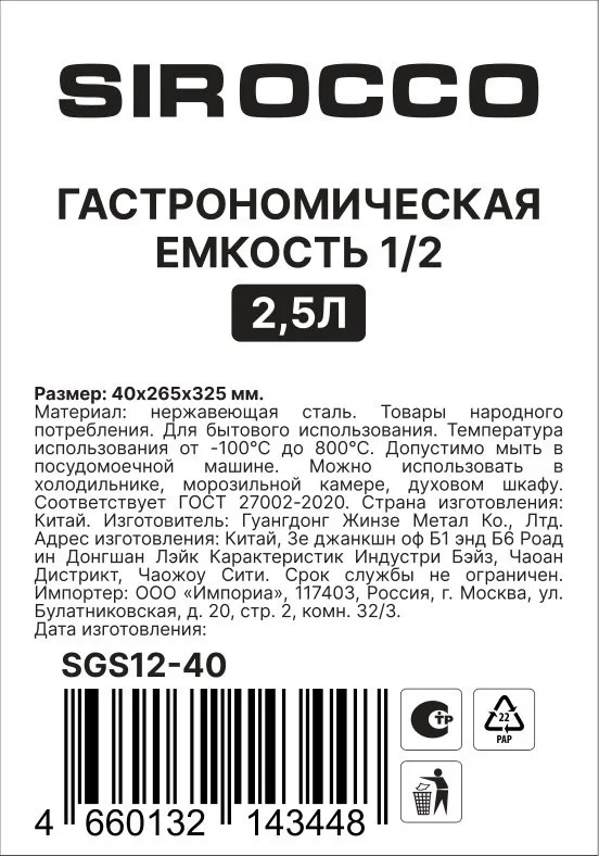 Гастроемкость нержавеющая сталь 1/2 40мм, 2.5л