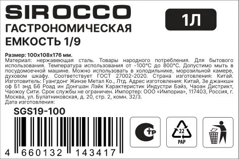 Гастроемкость нержавеющая сталь 1/9 100мм, 1л