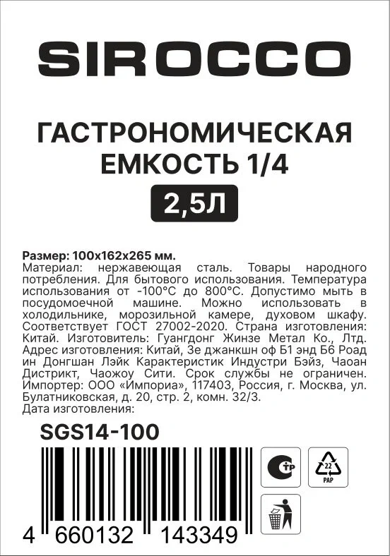 Гастроемкость нержавеющая сталь 1/4 100мм, 2.5л