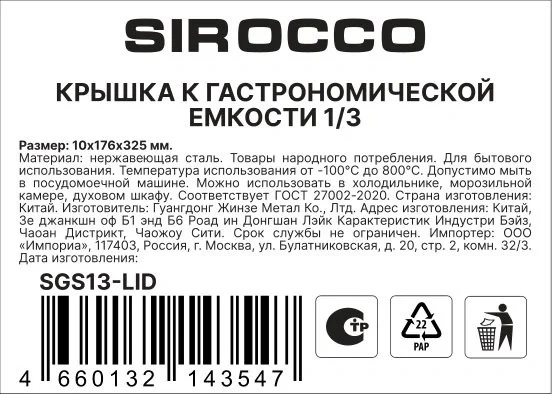 Крышка для гастроемкости нержавеющая сталь 1/3